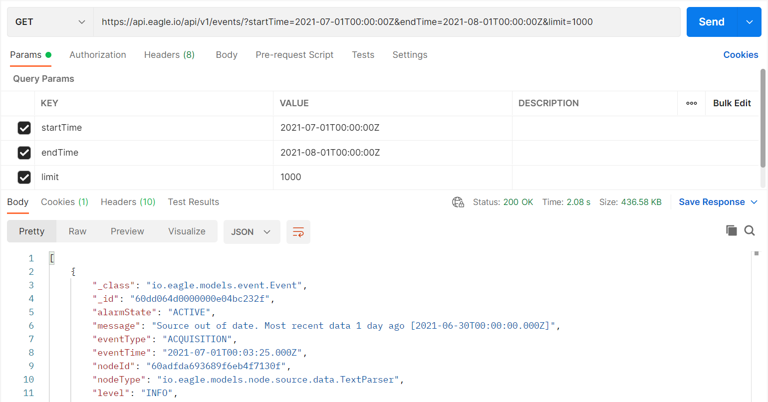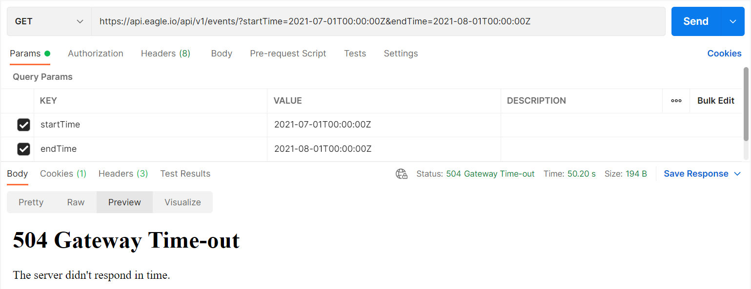 The GET /api/v1/events API endpoint will, as the name suggests, retrieve a list of all events available to the authenticated API key. We can (and definitely should) provide a time range when making a request to this endpoint, so lets try to get all events from the month of July. As usual when prototyping or testing any API endpoints, we will use the excellent Postman tool as our API client: